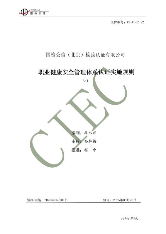 文件编号:CIEC-GZ-22 职业健康安全管理体系认证实施规则 版本:B/1