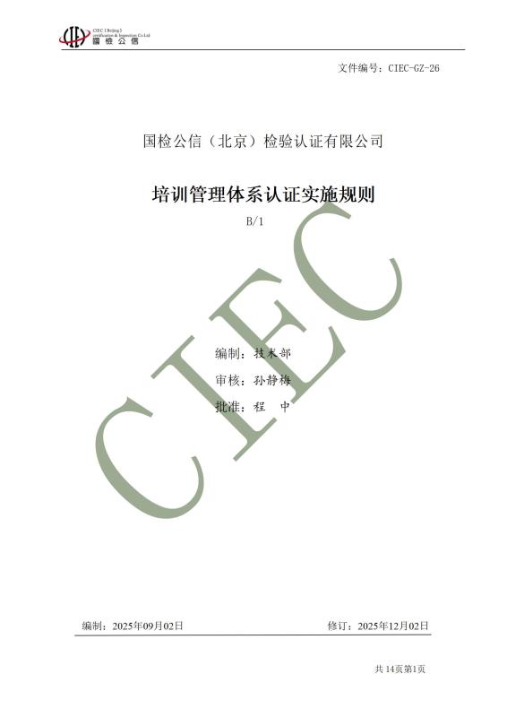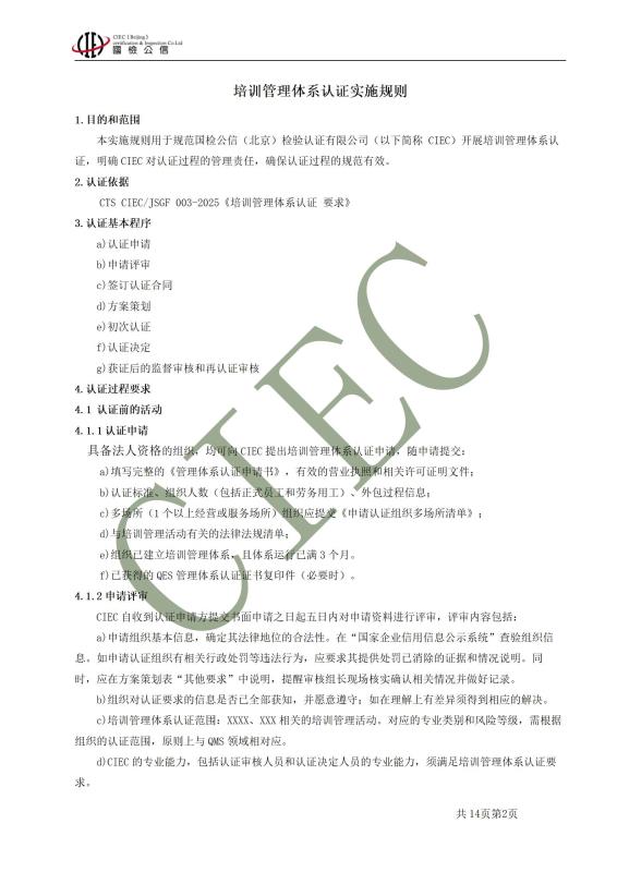 文件编号:CIEC-GZ-26 培训管理体系认证实施规则 版本:B/1 认证依据:CTS CIEC/JSGF 003-2025《培训管理体系认证 要求》 本认证规则归国检公信( 北京 )检验认证有限公司所有 , 对其拥有最终解释权 。 如需获取相关规则全文,请与以下联系方式获取: 电话:010-64938770 邮箱:CIEC1671@163.com;