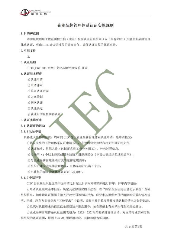 文件编号:CIEC-GZ-27 企业品牌管理体系认证实施规则 版本:B/1 认证依据:CIEC/JSGF 005-2025《企业品牌管理体系 要求》 本认证规则归国检公信( 北京 )检验认证有限公司所有 , 对其拥有最终解释权 。 如需获取相关规则全文,请与以下联系方式获取: 电话:010-64938770 邮箱:CIEC1671@163.com;