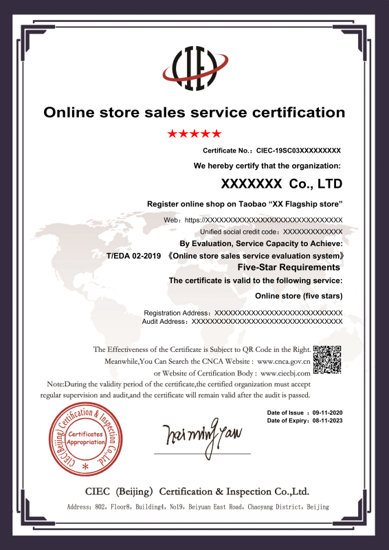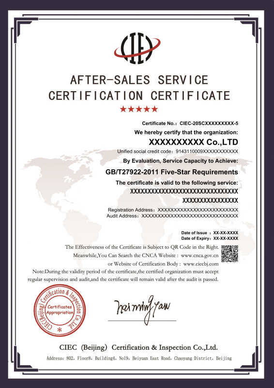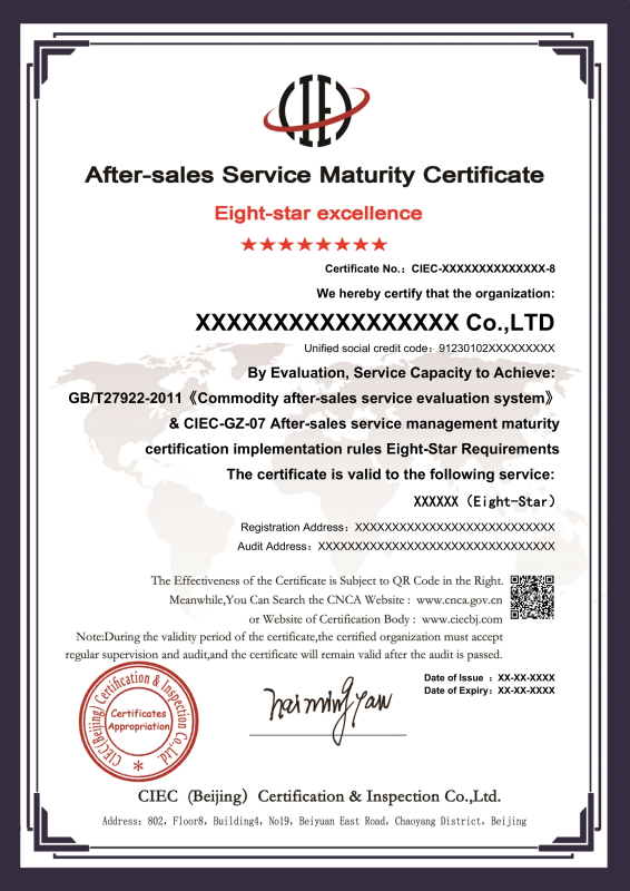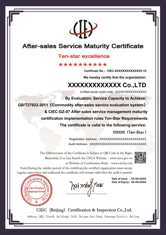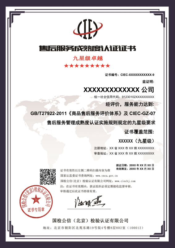 服务认证获证企业证书