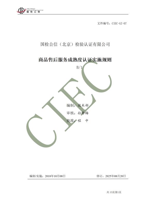 文件编号:CIEC-GZ-07 商品售后服务成熟度认证实施规则 版本:B/1