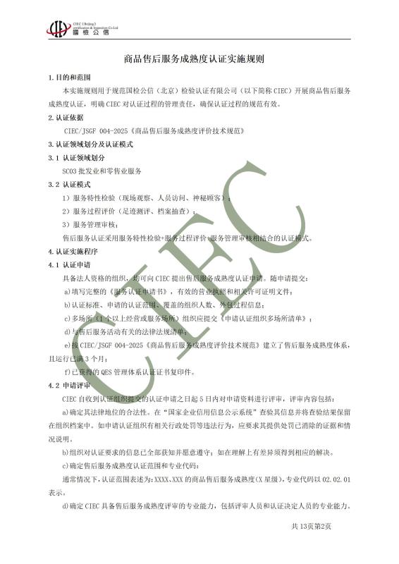 文件编号:CIEC-GZ-07 商品售后服务成熟度认证实施规则 版本:B/1 认证依据:CIEC/JSGF 004-2025《商品售后服务成熟度评价技术规范》 本认证规则归国检公信( 北京 )检验认证有限公司所有 , 对其拥有最终解释权 。 如需获取相关规则全文,请与以下联系方式获取: 电话:010-64938770 邮箱:CIEC1671@163.com;