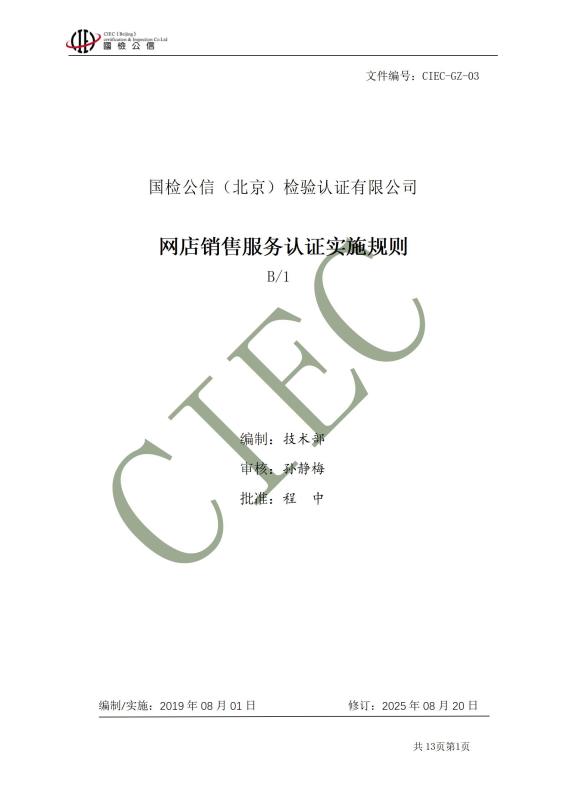文件编号:CIEC-GZ-03 网店销售服务认证实施规则 版本:B/1