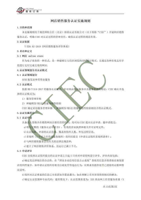 文件编号:CIEC-GZ-03 网店销售服务认证实施规则 版本:B/1 认证依据:T/EDA 02-2019《网店销售服务评价体系》 本认证规则归国检公信( 北京 )检验认证有限公司所有 , 对其拥有最终解释权 。 如需获取相关规则全文,请与以下联系方式获取: 电话:010-64938770 邮箱:CIEC1671@163.com;
