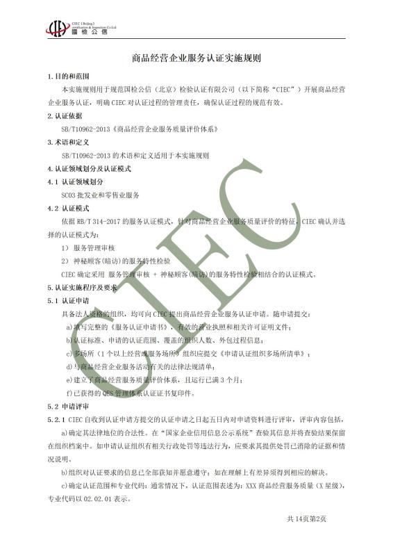 文件编号:CIEC-GZ-01 商品经营企业服务认证实施规则 版本:B/1 认证依据:SB/T10962-2013《商品经营企业服务质量评价体系》 本认证规则归国检公信( 北京 )检验认证有限公司所有 , 对其拥有最终解释权 。 如需获取相关规则全文,请与以下联系方式获取: 电话:010-64938770 邮箱:CIEC1671@163.com;