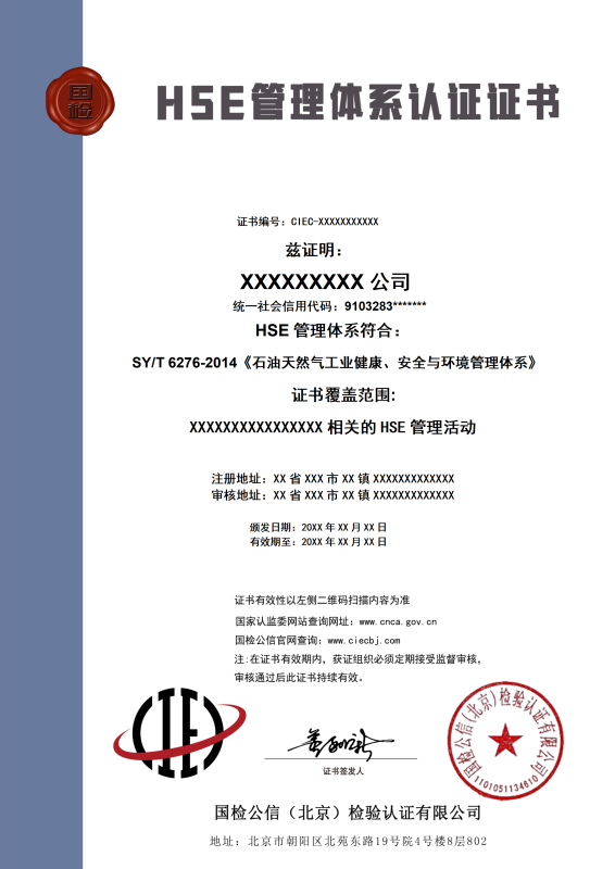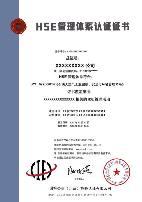 HSE管理体系认证证书