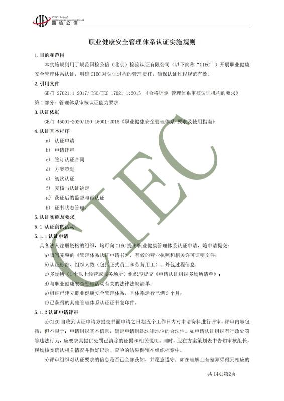 文件编号:CIEC-GZ-22 职业健康安全管理体系认证实施规则 版本:B/1 认证依据:GB/T 45001-2020/ISO 45001:2018《职业健康安全管理体系 要求及使用指南》 本认证规则归国检公信( 北京 )检验认证有限公司所有 , 对其拥有最终解释权 。 如需获取相关规则全文,请与以下联系方式获取: 电话:010-64938770 邮箱:CIEC1671@163.com;