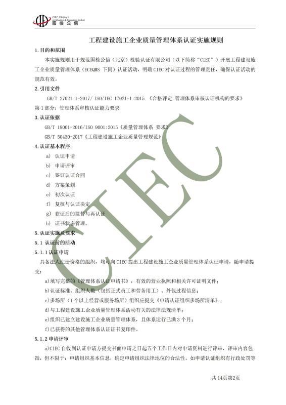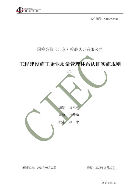 文件编号:CIEC-GZ-23 工程建设施工企业质量管理体系认证实施规则 版本:B/1