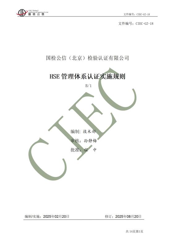 文件编号:CIEC-GZ-18 HSE管理体系认证实施规则 版本:B/1