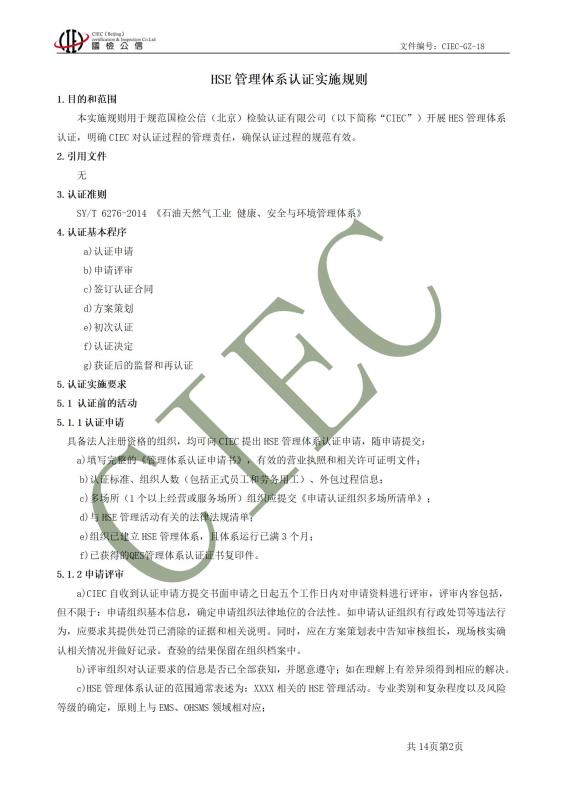 文件编号:CIEC-GZ-18 HSE管理体系认证实施规则 版本:B/1 认证依据:SY/T 6276-2014《石油天然气工业 健康、安全与环境管理体系》 本认证规则归国检公信( 北京 )检验认证有限公司所有 , 对其拥有最终解释权 。 如需获取相关规则全文,请与以下联系方式获取: 电话:010-64938770 邮箱:CIEC1671@163.com;